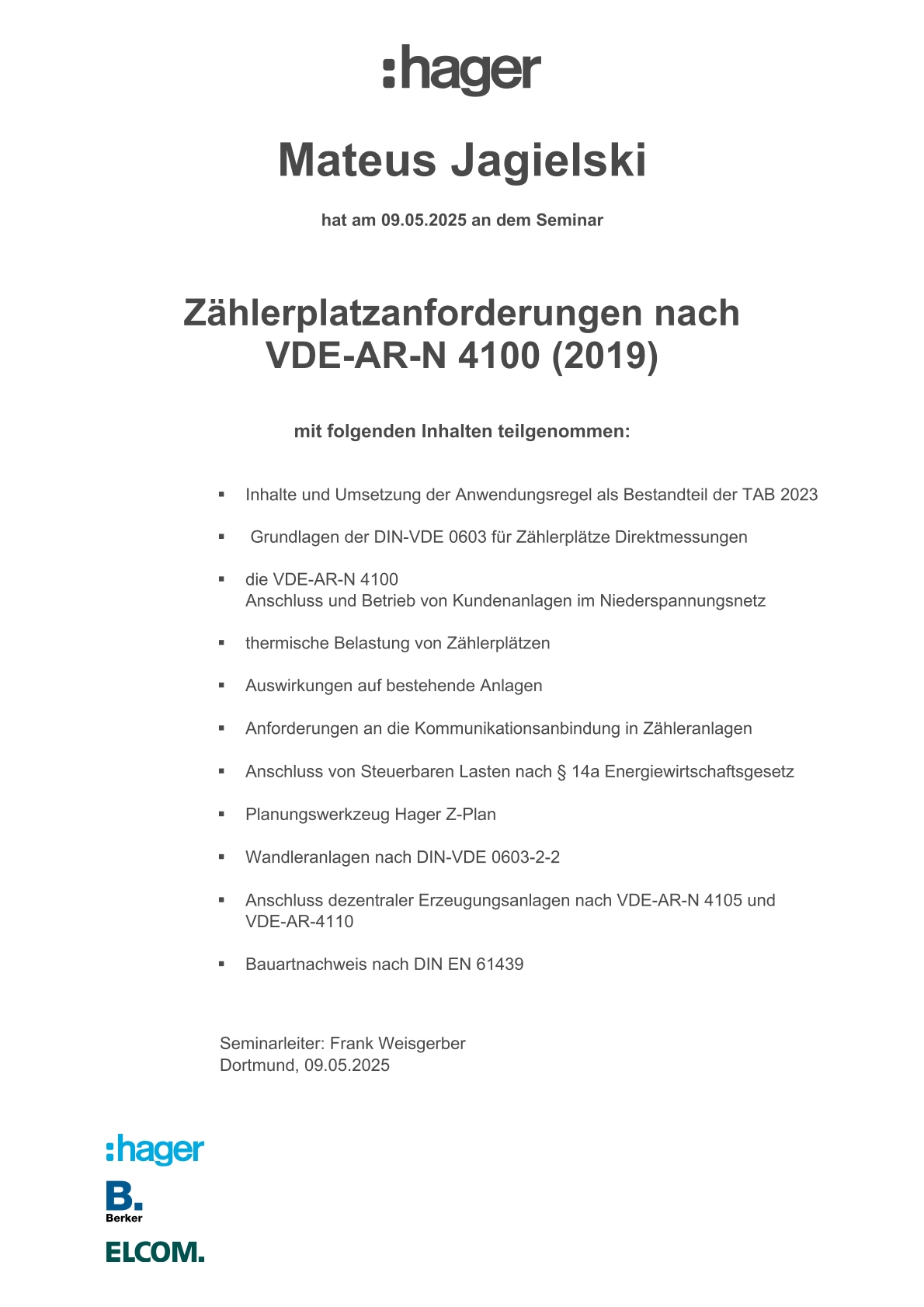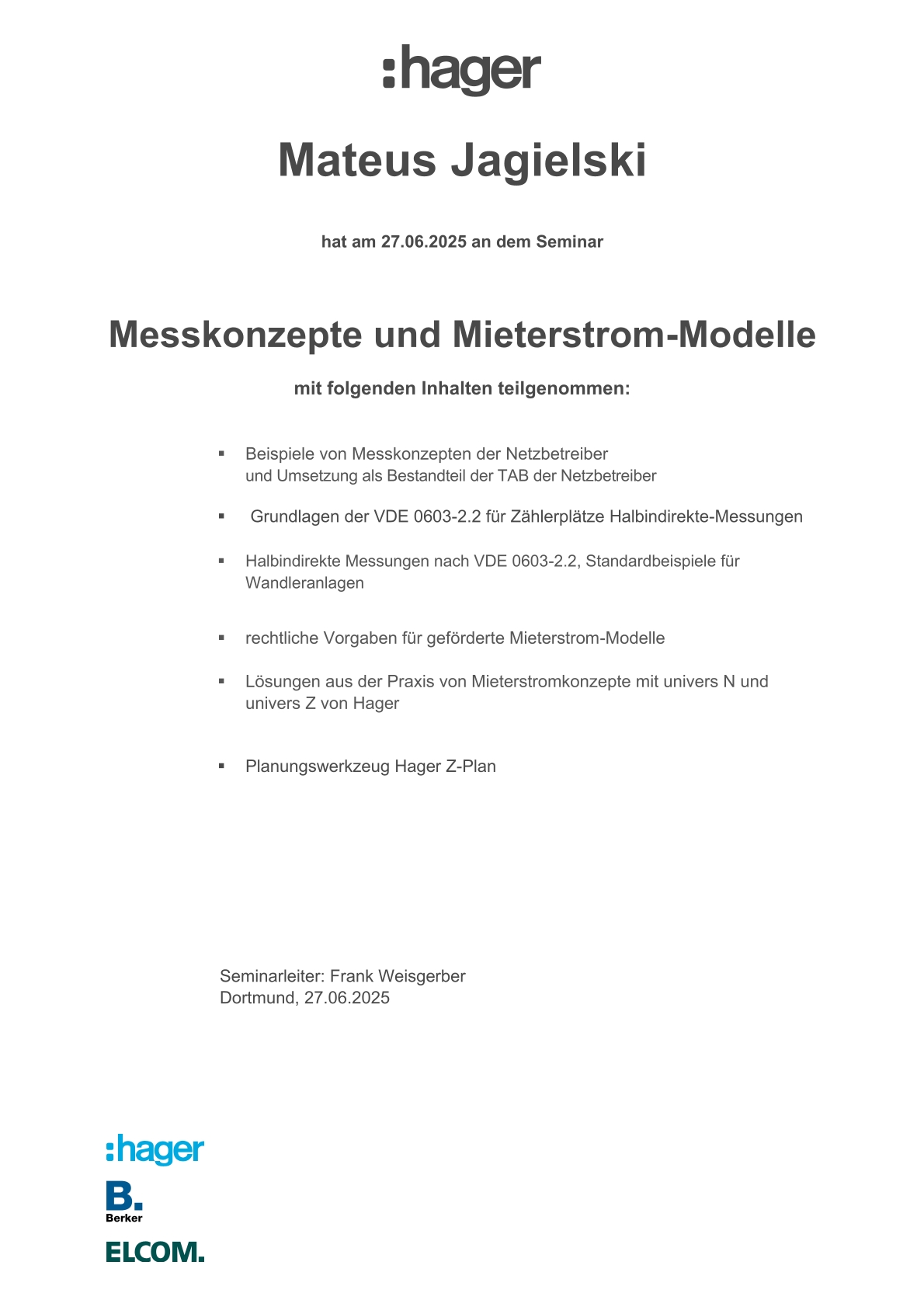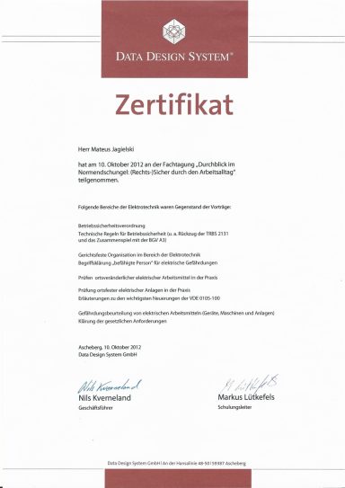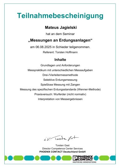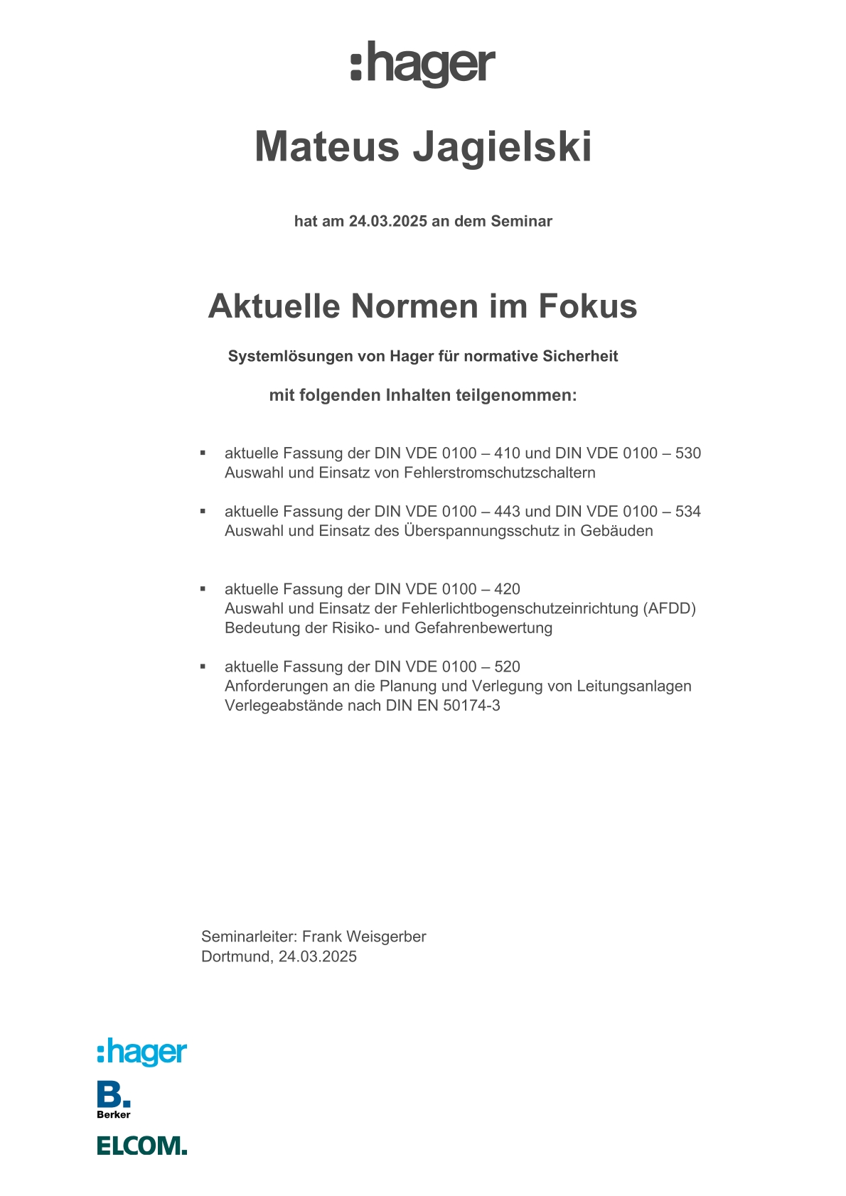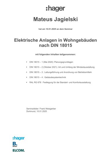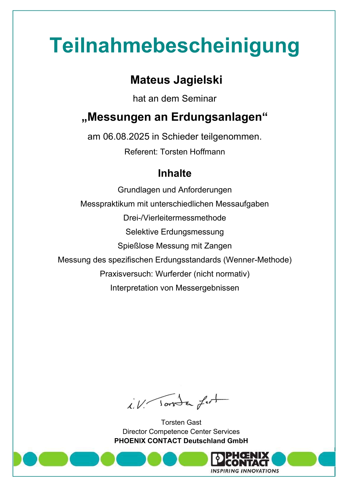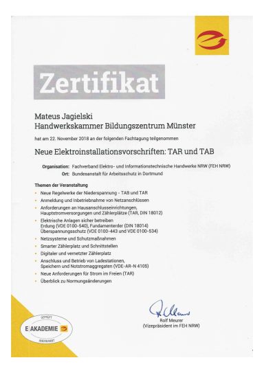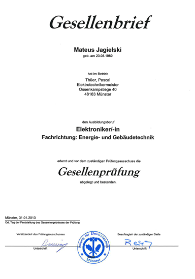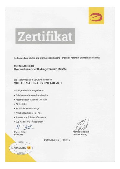 Mein Name ist Mateus Jagielski. Ich bin Elektrotechnikermeister, hauptamtlicher Fachdozent für Elektrotechnik und Sachverständiger für das Elektrotechnikerhandwerk.
